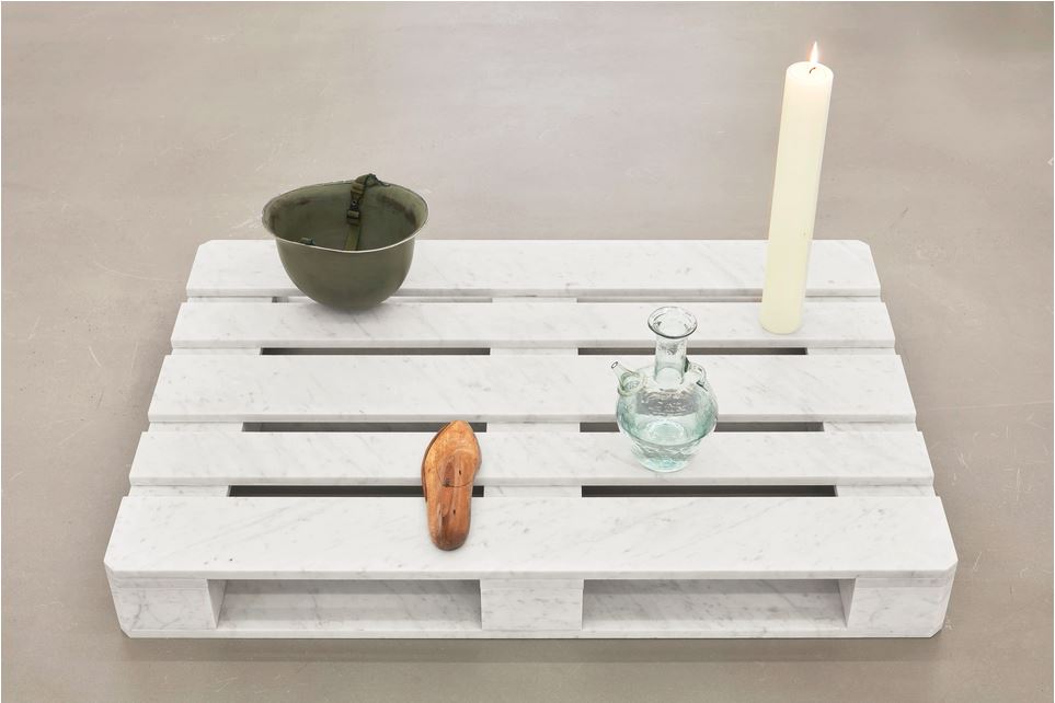 Auf Marmorpodesten sehen wir Glaskaraffen, zusammengesetzt aus zersplitterten Trümmern der Explosion im Hafen von Beirut, Helme, die während des libanesischen Bürgerkriegs von gegnerischen Milizen getragen wurden, Schuhleisten, die Tabets Großvater im Libanon zur Herstellung von Schuhen für Amputierte des Zweiten Weltkriegs anfertigte. Eine Kerze steht in der Hamburger Galerie neben diesen Relikten der Versehrung, sie brennt dort ununterbrochen. Das Licht wirft einen Schatten zurück; es leuchtet voraus in die Dunkelheit.
