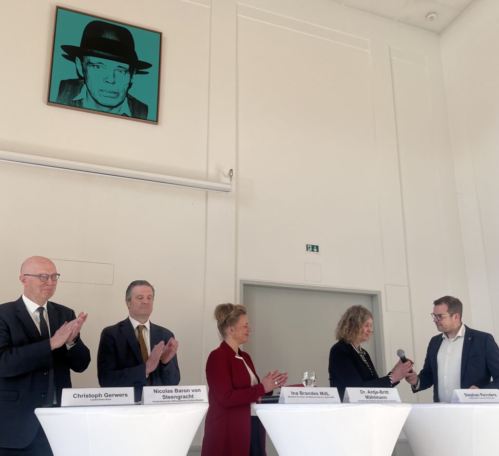 NRW Kultur- und Wissenschaftsministerin Ina Brandes (CDU), sie ist neben Ministerpräsident Hendrik Wüst Kuratoriumsvorsitzende der Stiftung, war nach Bedburg-Hau geeilt, um auf einer eigens einberufenen Pressekonferenz den „Durchbruch“ zu verkünden. In ihrer Doppelrolle verkündete sie gleich triumphierend: „Schloss Moyland hat gewonnen.“ Die Erleichterung über den Sieg war ihr anzusehen. Doch worin besteht eigentlich der Durchbruch und was meint Brandes, wenn sie erwartet, mit dieser neuerlichen Geldspritze die Forschung zu Beuys „extrem“ voranzubringen? Endlich, so war zu erfahren, soll eine Beuys Online-Datenbank aufgebaut und das lange erwartete Werkverzeichnis zur Beuys-Sammlung auf Schloss Moyland erstellt werden.