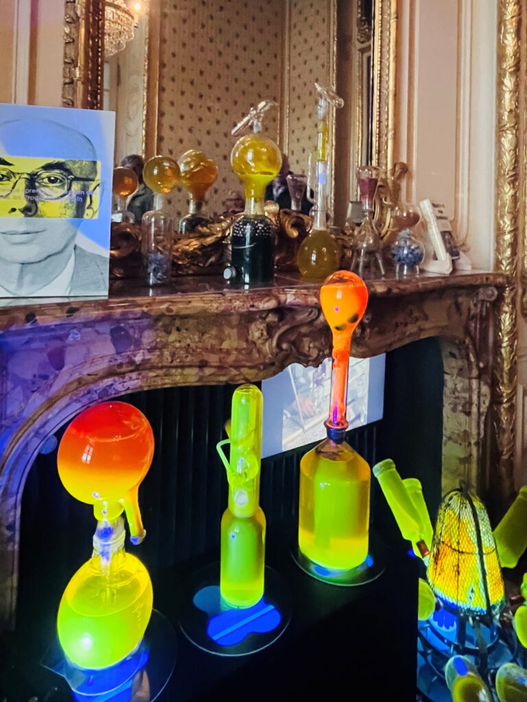 Die Fortsetzung und der inszenatorische Kulminationspunkt der Ausstellung folgt in den Räumen des Corps de Logis von Schloss Benrath. Auf und in den historischen Kaminsimsen der spätbarocken Repräsentationssäle hat Helmut Schweizer fire places arrangiert. Das Feuer glüht und leuchtet hier beängstigend und schön diabolisch in Form fluoreszierender Farbigkeit, die von den großen Wandspiegeln aufgefangen und zauberhaft reflektiert wird. In einer Anordnung aus Glaskolben, Laborflaschen und –Gläsern, die Helmut Schweizer mit attraktiven, gleichwohl gefährlich aussehenden Flüssigkeiten gefüllt hat, sind hier Installationen von großer Ambivalenz entstanden – hinreißend und erschreckend zugleich. Sie rufen unser Erstaunen hervor, erinnern an fürstliche Wunderkammern wie an Laborversuche von Wissenschaftler, die mit dem Atom experimentierten. Oder handelt es sich um Versuche aus Zeiten der Aufklärung, da in Pariser Laboren von Materialisten wie Baron d`Holbach und anderer an einer rätselhaften aber noch verheißungsvoll gedachten Zukunft geforscht wurde?