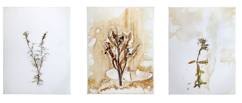 Wie jeder Ausstellungsort in seiner Weise auf die ausgestellten Werke abfärbt, sieht man sich als Betrachter auch in Benrath mit spezifischen Assoziationen und Fragen konfrontiert, die in unterschiedliche Richtungen weisen. Worin liegt hier das spezifische Künstlerische? Was sind hier Anliegen und Anspruch? Welche Idee verfolgen die Kuratoren und Kuratorinnen? – Die Ästhetik liegt zunächst in den gesuchten Anklängen an eine wissenschaftliche Praxis, die als Herbarium in ihrer seriellen Ordnung eine eigene Schönheit besitzt. In diesem Seriellen aber läge wiederum ein Anknüpfungspunkt an die Entstehungszeit der Schweizerischen Pflanzensammlung, als die Konzeptkunst in den 1970er Jahren in Europa aufzog und Schweizer, noch in Karlsruhe, in den Dunstkreis von Joseph Beuys, Otto Piene (von dem Schweizer die Plastikfolien übernahm) und seinem Mitstudenten Lothar Baumgarten führte. Baumgarten folgte er wenige Jahre später an die Kunstakademie nach Düsseldorf. Die Konzeptkunst, darauf weist Robert Fleck in seinem Katalogbeitrag hin, beinhaltete in Konsequenz auch die Idee, dass das Sammeln selbst als performativer und gestischer Akt zu verstehen sei. Schließlich ist man mit Beuys und Baumgarten und manchen anderen Künstlern (zu denken wäre etwa auch an den Land Art Künstler Richard Long) damit auch bei dem grundierenden Motiv angelangt, das die Arbeit Helmut Schweizers ein Leben lang anregte und immer wieder neu antrieb: Die Natur, ihre Schönheit, ihre Fragilität und ihre Gefährlichkeit durch die Verbindung mit Technologien und somit ihre spezifische, unbeherrschbare Gewalt.