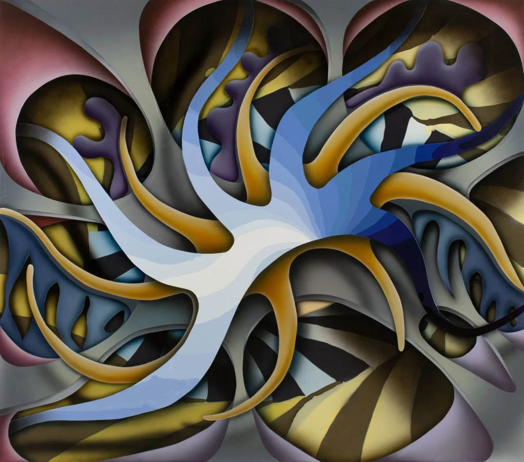 Da ist viel von der Revolution des Sehens auf unserer Bildschirmwelt, wo ja auch unsere Bildflächen ineinander kippen. Aber nichts ist zitiert. Alles ist übersetzt. Auf jedem Bild gibt es dutzende Bildebenen. Aber in Wirklichkeit ist es nur eine Bildebene. Man mag an Frank Stella denken, als der Miterfinder der Minimal Art Anfang der 1980er Jahre plötzlich „barock“ wurde. Diese Malerei hat aber nichts vom Postmodernismus der 1980er Jahre. Alles ist präzise fast ex-nihilo konstruiert. Nur implodiert das Bild beständig. Diese Technik hat sich Harm Gerdes seit 2023, in Athen lebend und arbeitend, aus zahlreichen Versuchen erarbeitet.